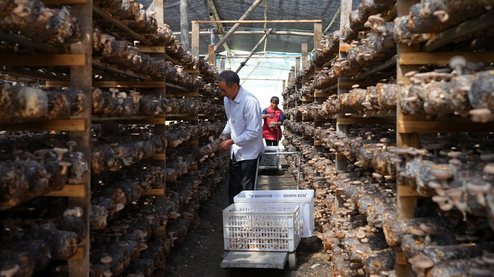 忙着采摘香菇的菇农们